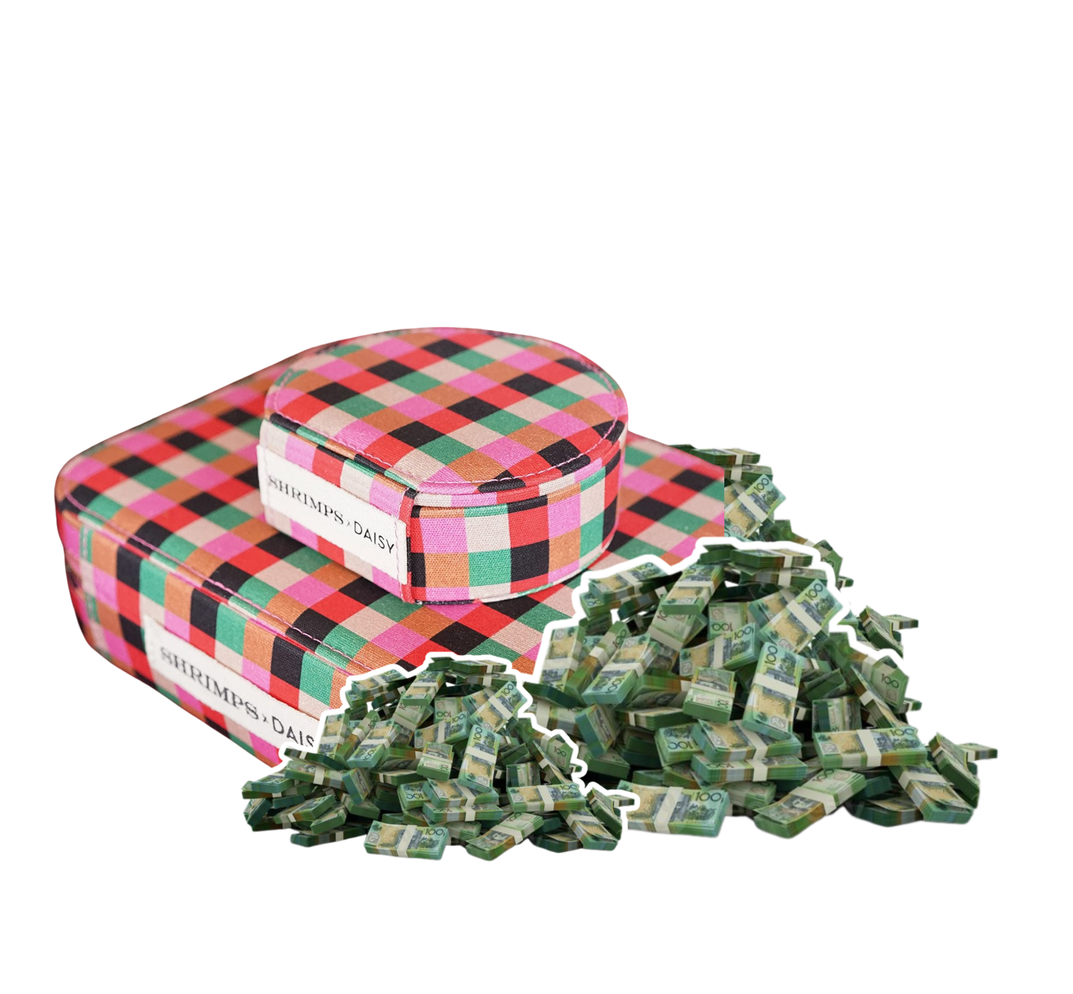 Shrimps iconic pink checkerboard print brings the fun, featuring their bestselling compact and large jewellery cases, this set is made for summer on the move.